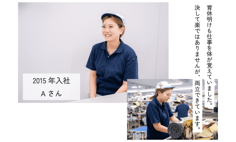 産休・育休に入るのが決まったときから、復帰する前提でいました。復帰したときは忙しい時期だったのもあって、ブランクを感じる間もなく1~2時間慣らした後すぐに生産ラインに戻りました。1年も離れていたので少し不安だったんですが、手を動かしてみたら自然に縫えて、体が仕事を覚えてたみたいです。